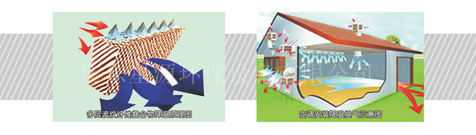 在蒸發(fā)降溫介質(zhì)內(nèi)與水充分進(jìn)行熱量交換,因水蒸發(fā)需吸熱從而使空氣的溫度降低,并且在風(fēng)機(jī)和送風(fēng)管的作用下將冷空氣送至指定位置。