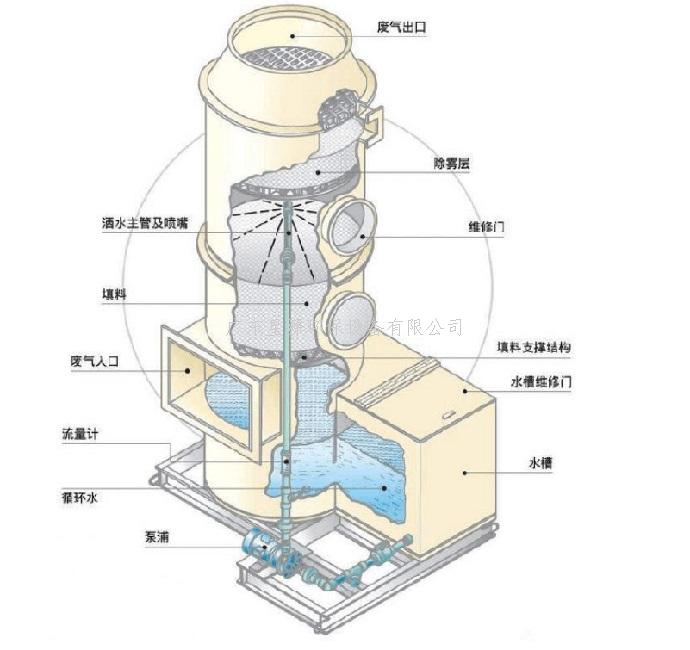 工業(yè)廢氣由風(fēng)管引入噴淋水塔,經(jīng)過填料層,廢氣與水及藥劑進行充分的氣液接觸,廢氣經(jīng)過物理吸附及化學(xué)反應(yīng)后,再經(jīng)除霧板脫水除霧后由風(fēng)機排入大氣。